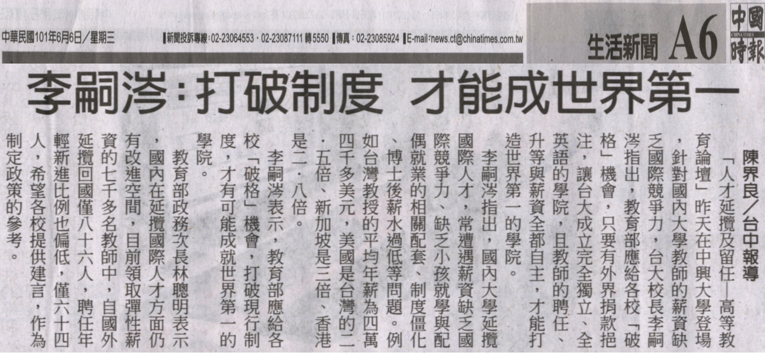 「人才延攬及留任─高等教育論壇」昨天在中興大學登場,針對國內大學教師的薪資缺乏國際競爭力,台大校長李嗣涔指出,教育部應給各校「破格」機會,只要有外界捐款挹注,讓台大成立完全獨立、全英語的學院,且教師的聘任、升等與薪資全都自主,才能打造世界第一的學院。