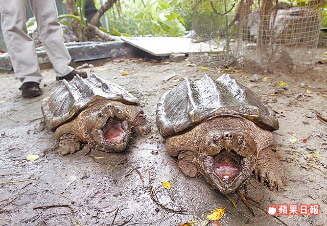 中興湖前天清淤,清出兩隻體長近五十公分的大鱷龜。翁清雅攝 |