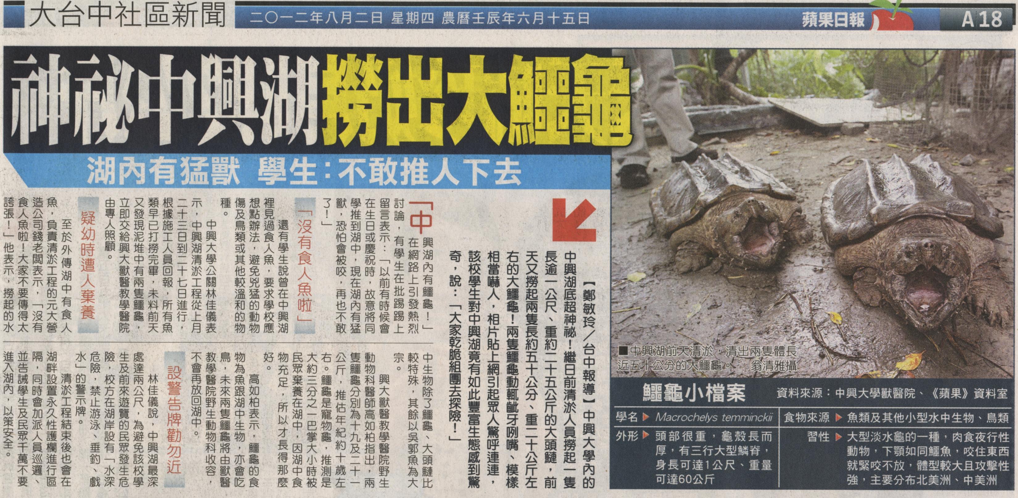 中興大學內的中興湖底超神祕!繼日前清淤人員撈起一隻長逾一公尺、重約二十五公斤的大頭鰱,前天又撈起兩隻長約五十公分、重二十公斤左右的大鱷龜!兩隻鱷龜動輒齜牙咧嘴、模樣相當嚇人,相片貼上網引起眾人驚呼連連,該校學生對中興湖竟有如此豐富生態感到驚奇,說:「大家乾脆組團去探險!」