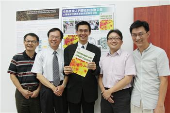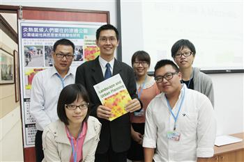 興大景觀學程林子平教授(中)、蔡岡廷副教授(右2)及聯合大學建築系黃瑞隆教授(左1)共同發表研究成果,興大農資學院陳樹群院長(左2)及興大景觀學程董建宏助理教授(右1)共同出席發表會 |