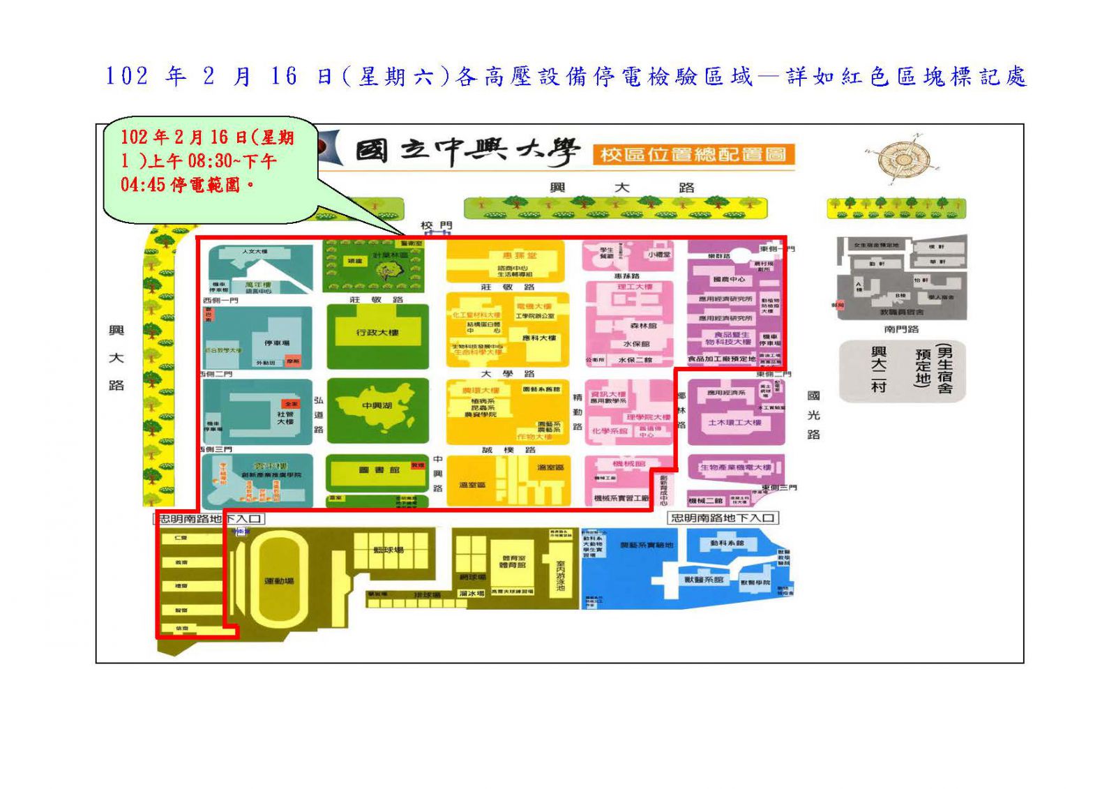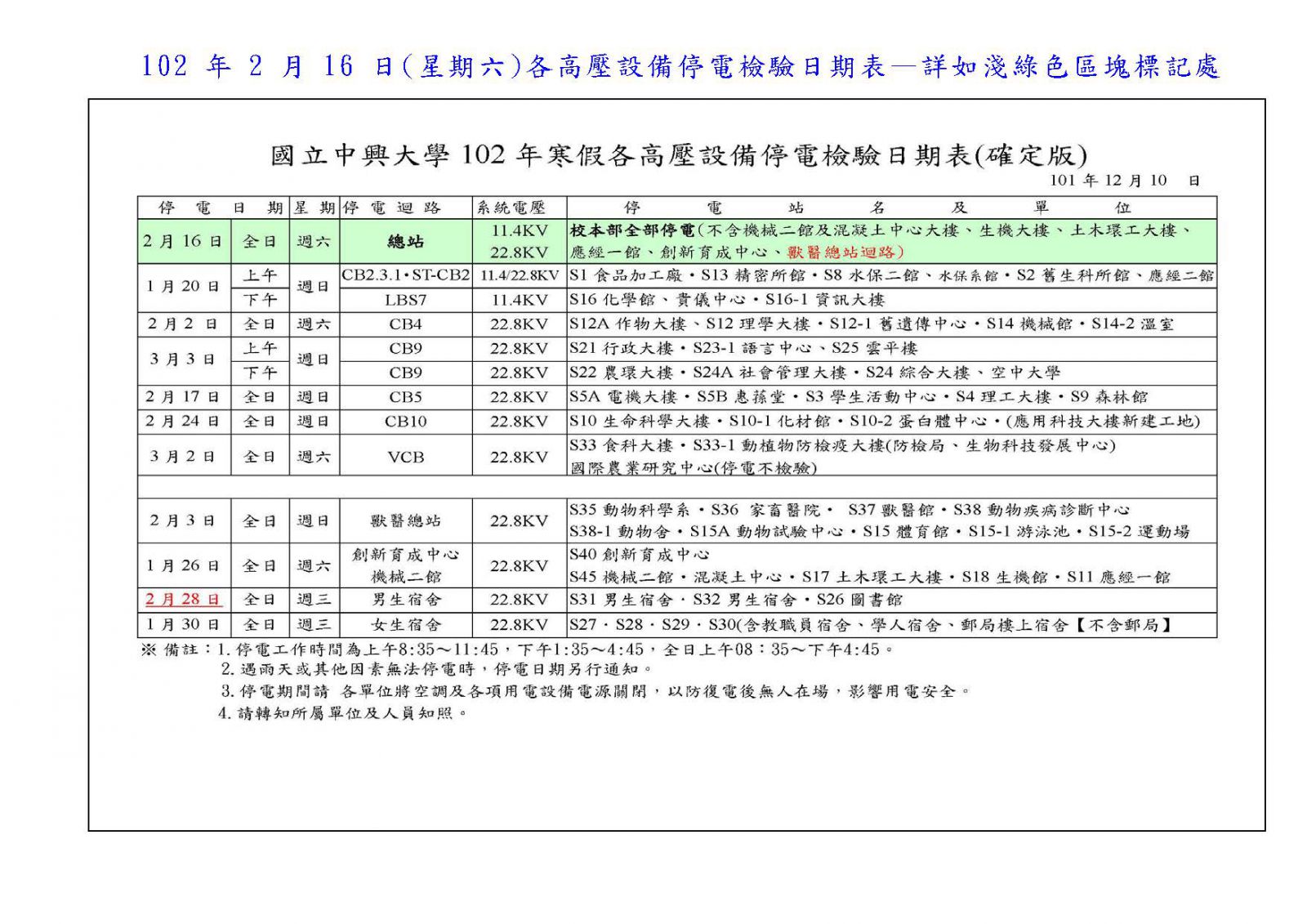 【營繕組停電通知】※102年2月16日(星期六)各高壓設備停電檢修暨男生宿舍站VCB真空保護開關更換工程通知※