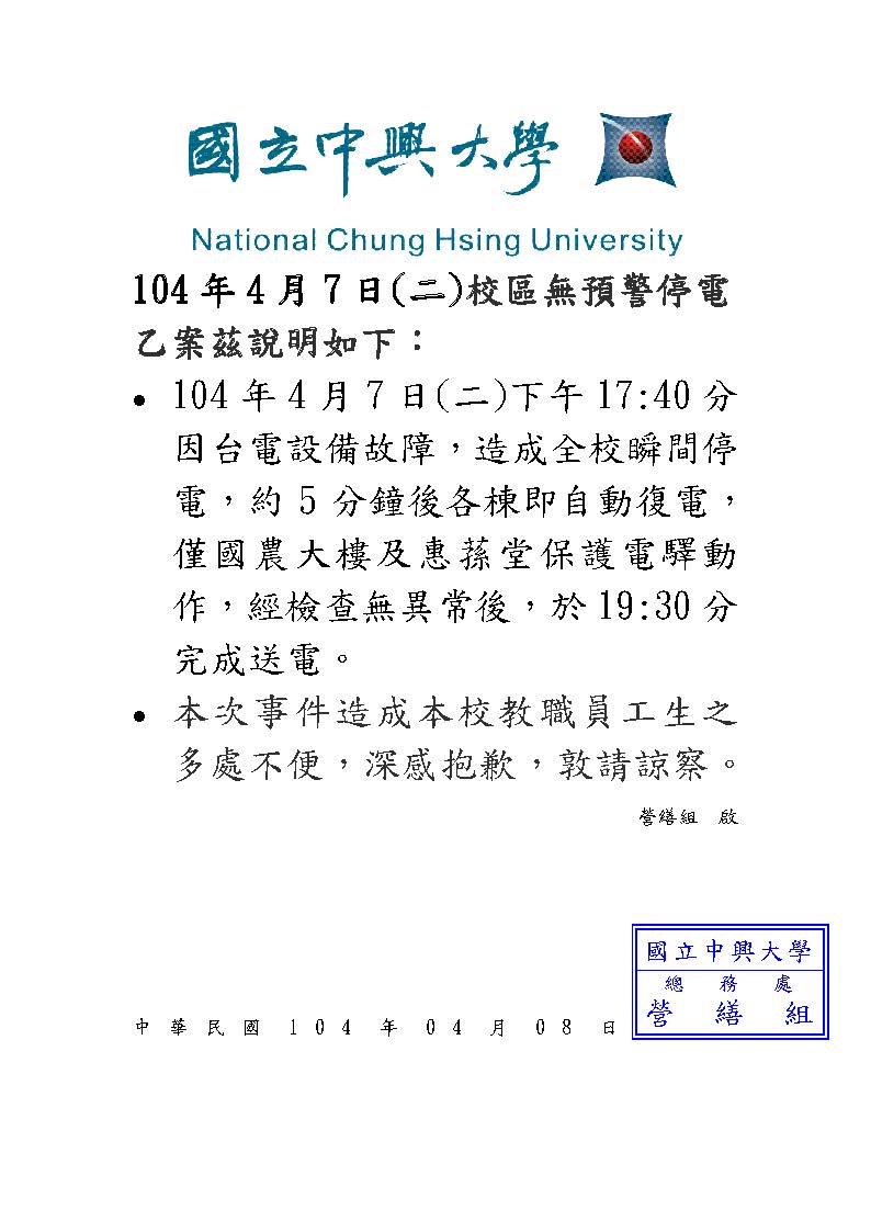 【營繕組公告】104年4月7日(二)校區無預警停電乙案茲說明