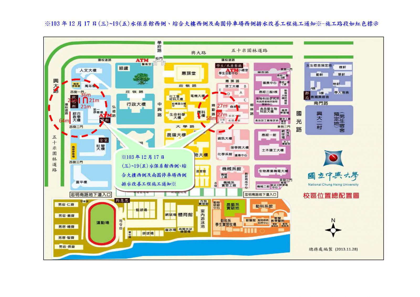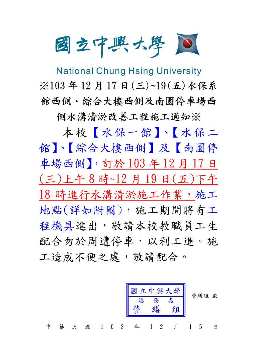 【營繕組施工通知】※103年12月17日(三)~19(五)水保系館西側、綜合大樓西側及南園停車場西側排水改善工程施工通知※